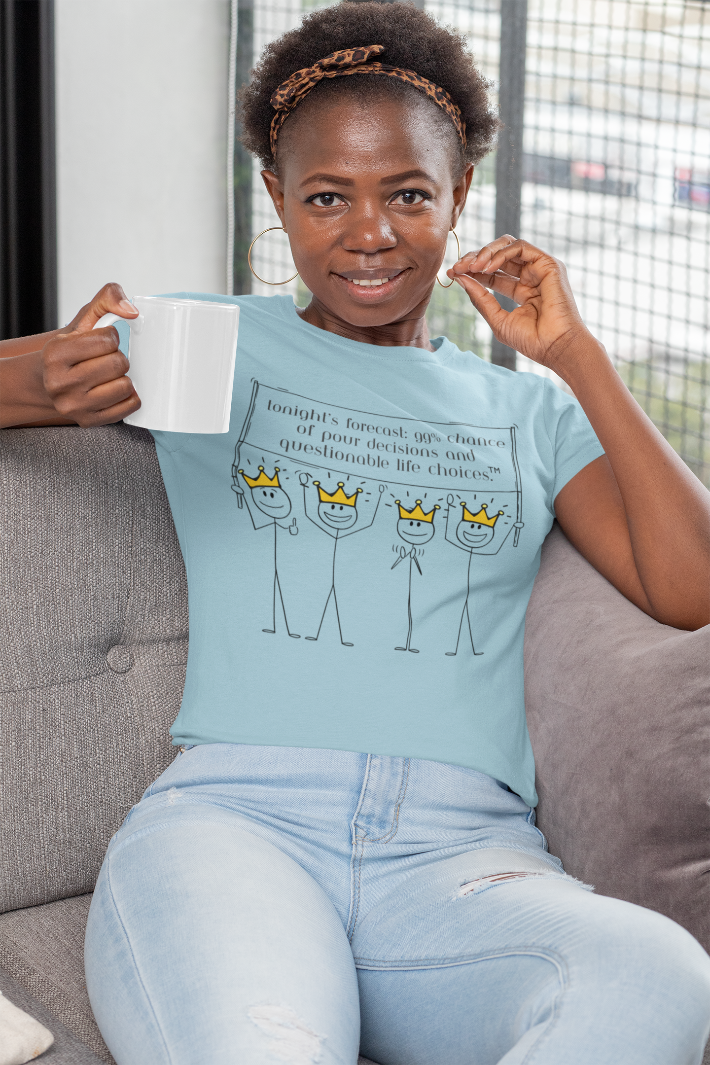 - Crowned stick figure squad & cheeky quote: “Tonight’s Forecast: 99% Chance of Pour Decisions and Questionable Life Choices™”