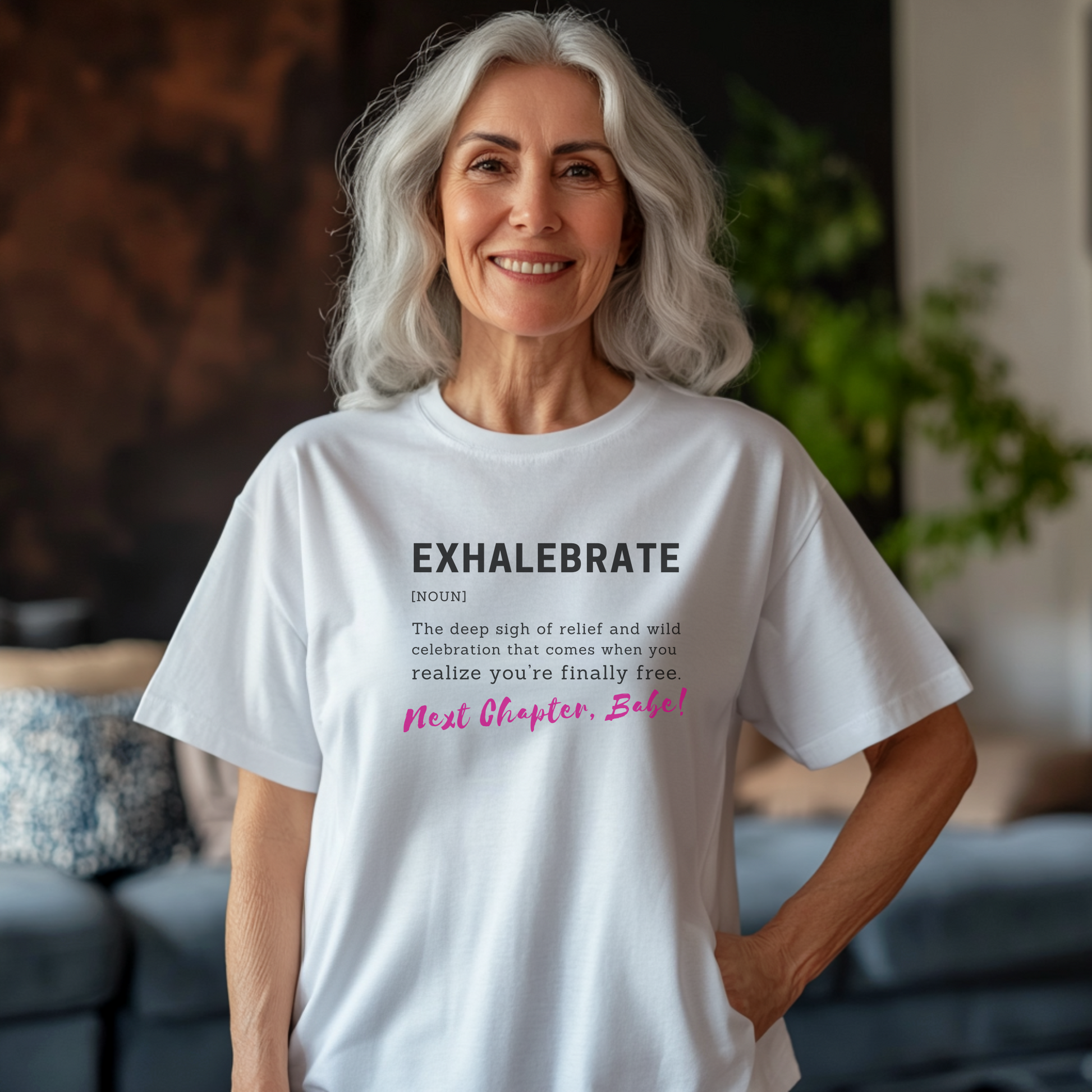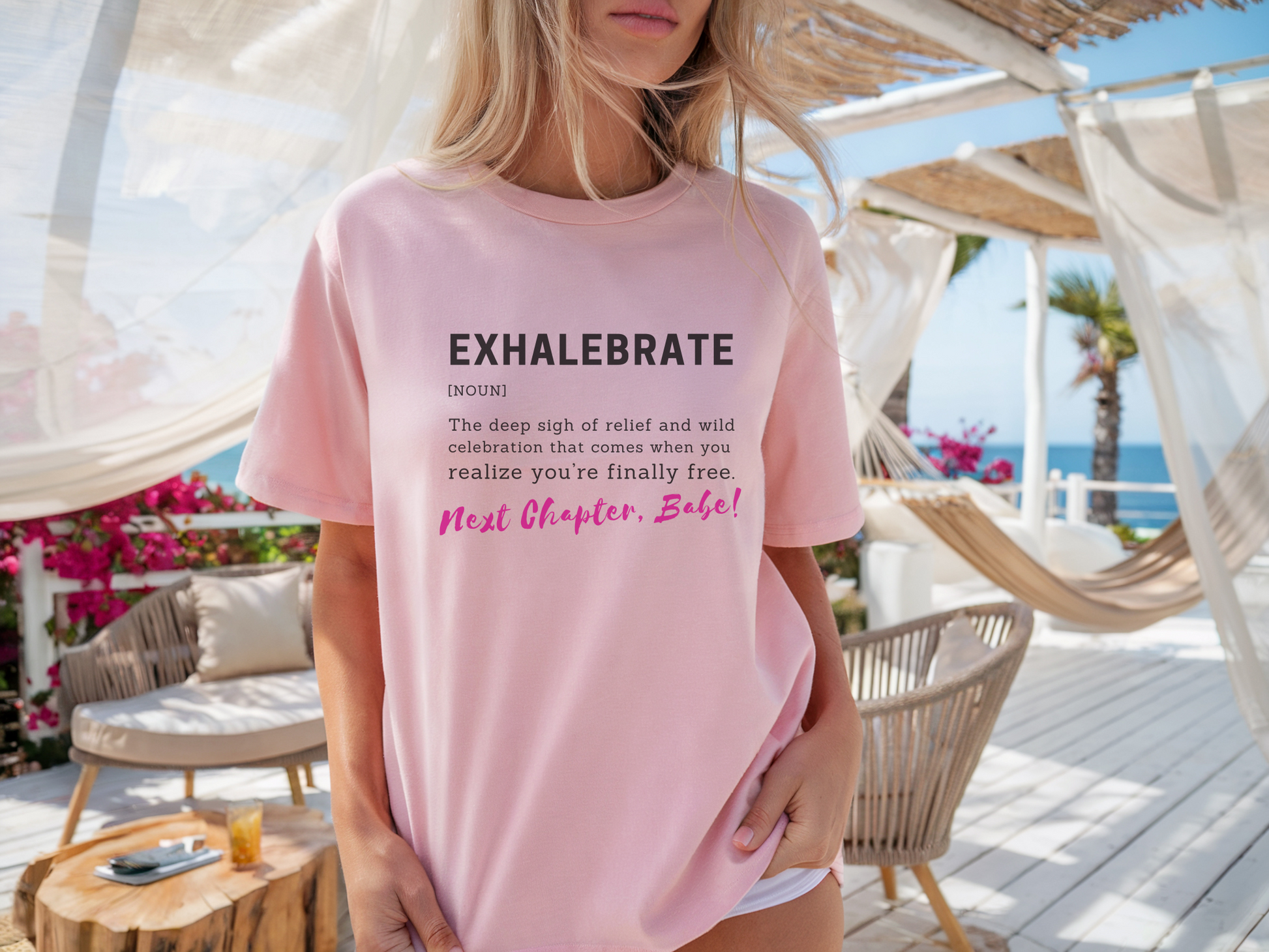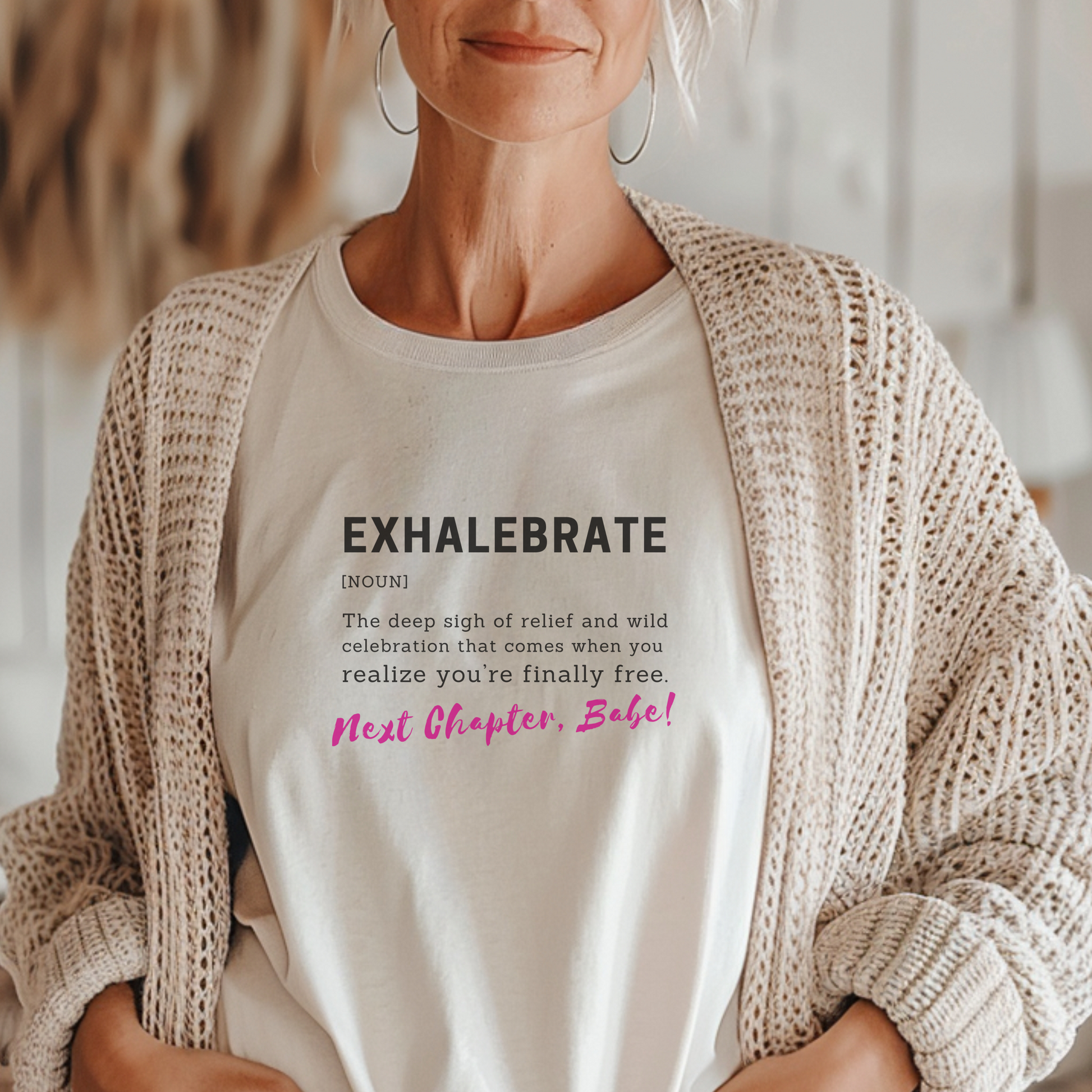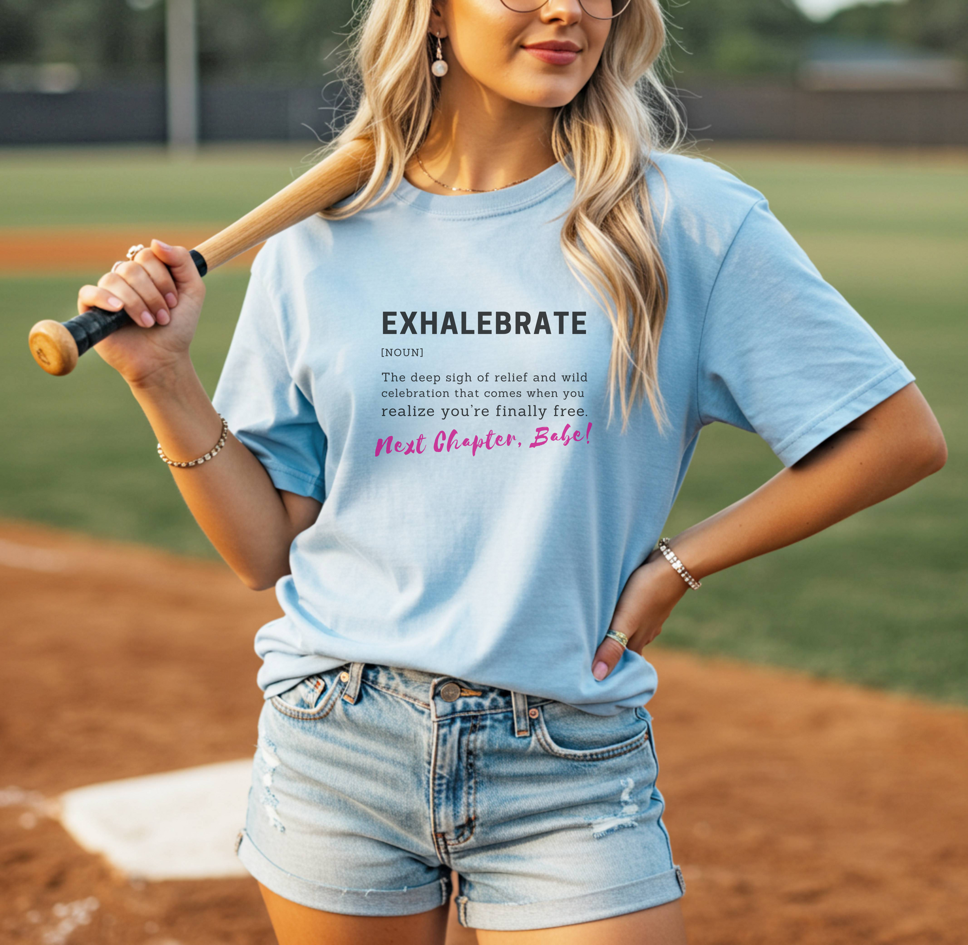 Step boldly into your next chapter with the tee that says it all. The “Exhalebrate” shirt is your must-have for divorce parties, breakup bashes, and girls’ weekends where the only thing left behind is the drama. Show off that bold definition and the signature hot pink “Next Chapter, Babe!”—because you’re finally free, and it’s time to celebrate it.