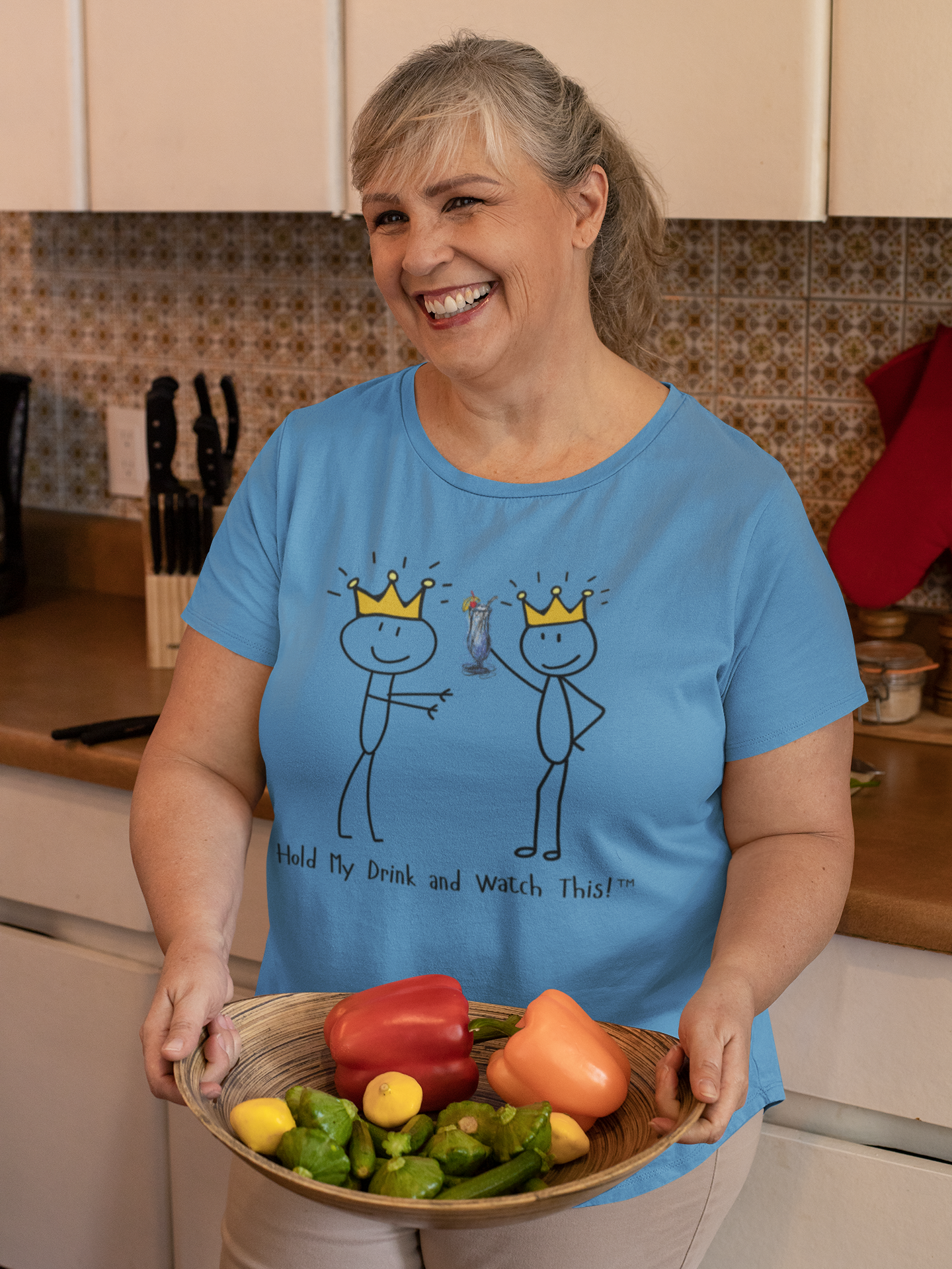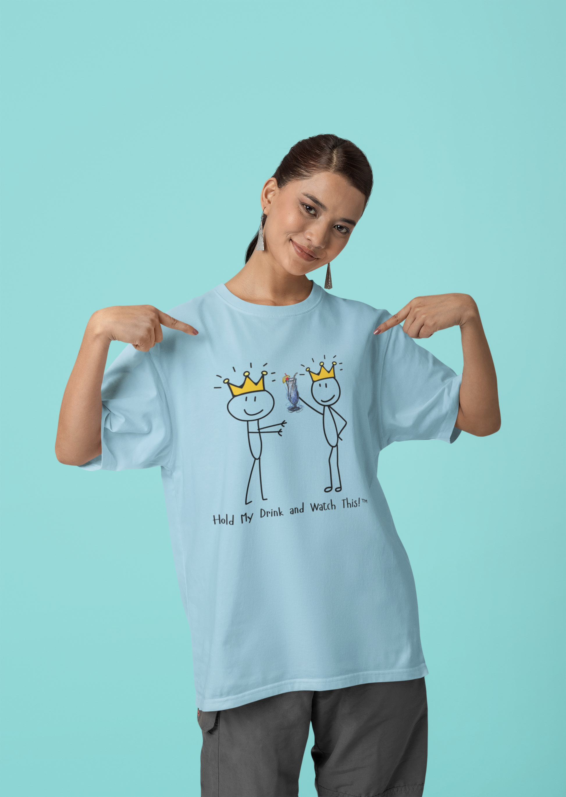 - Cheeky “Hold My Drink and Watch This!™” crowned stick figure design with cocktail: Pure party energy.
