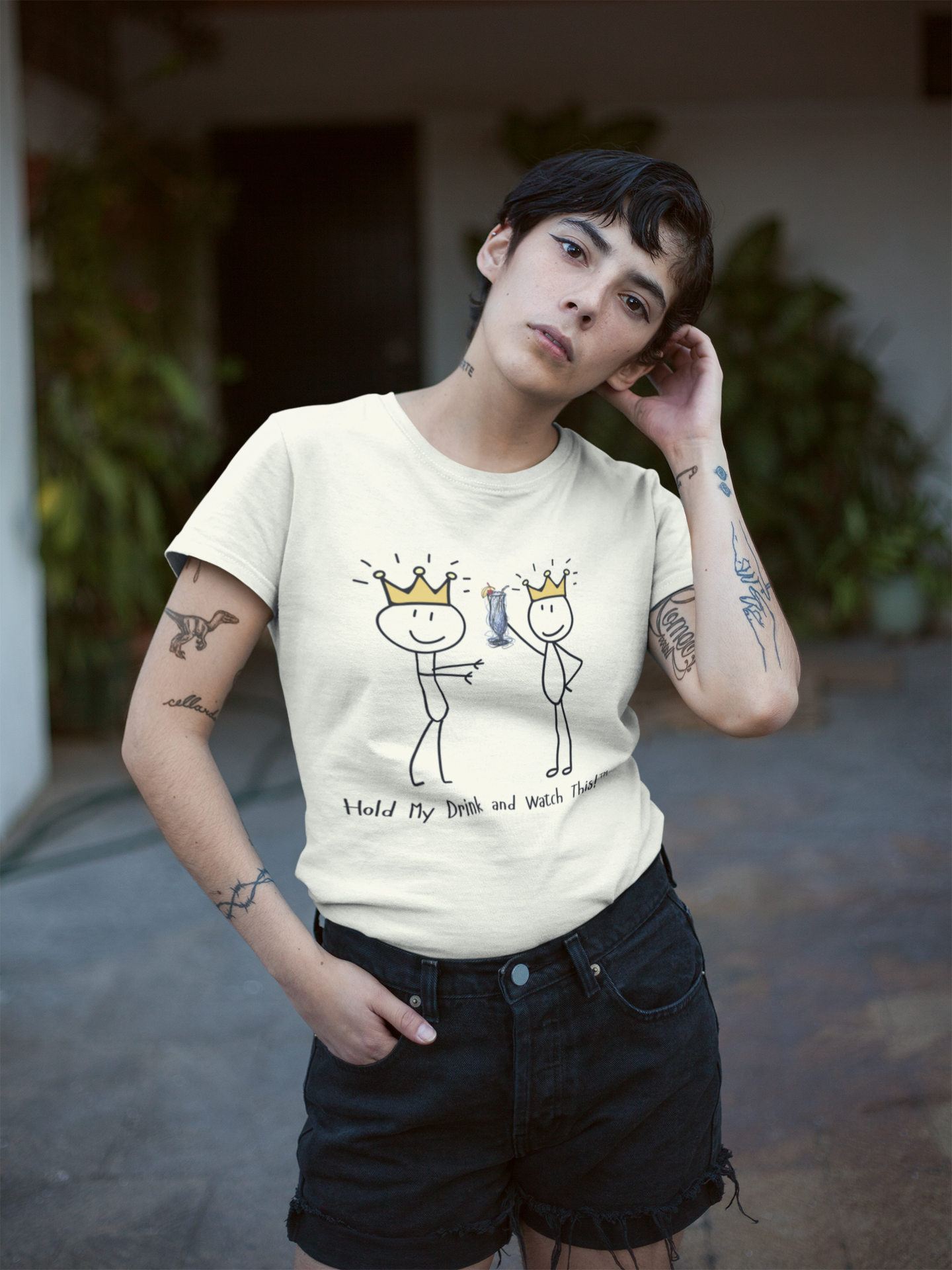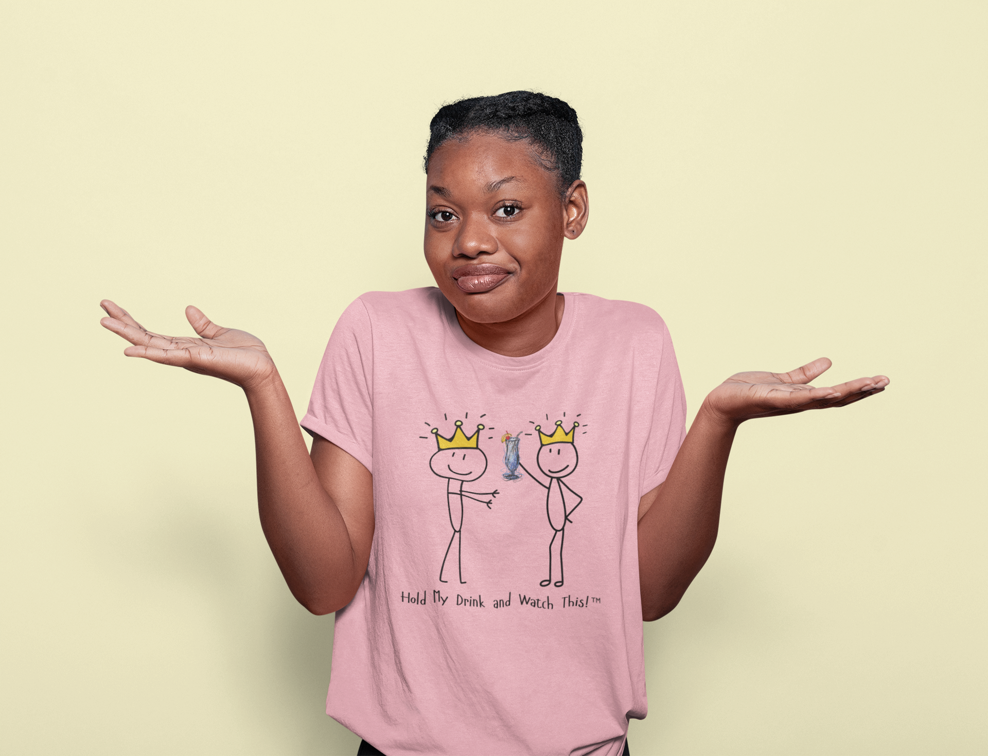 - Cheeky “Hold My Drink and Watch This!™” crowned stick figure design with cocktail: Pure party energy.