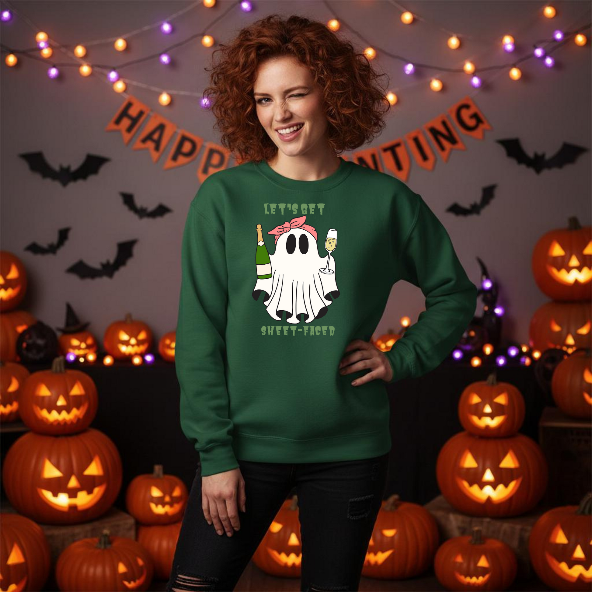 Boo, babe! Ready to haunt the party and keep it cozy? Slip into the “Let’s Get Sheet-Faced” sweatshirt—featuring an adorable ghost clutching a bottle and glass, this is your official uniform for spooky sips, girls’ nights, and all things mischievously fun. Whether you’re out trick-or-treating or just keeping it chill at home, this sweater keeps you warm and your sass level high.