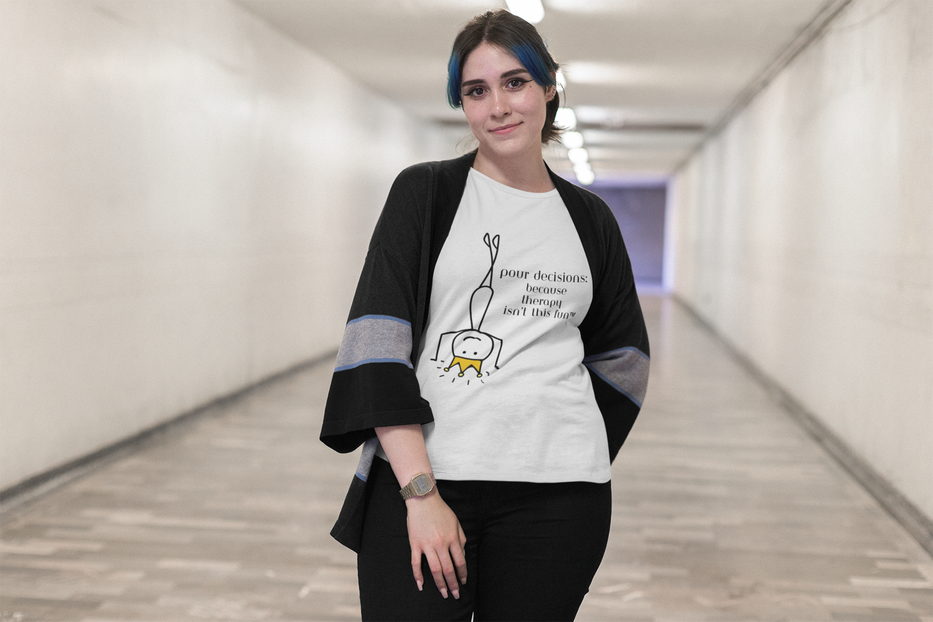 Ready to skip the couch and dive straight into the party? The “Pour Decisions: Because Therapy Isn’t This Fun™” tee comes with a Wheel of Dare QR code right on the sleeve—scan to unlock an exclusive party game and let the dares (and the laughter) begin from the very first pour!