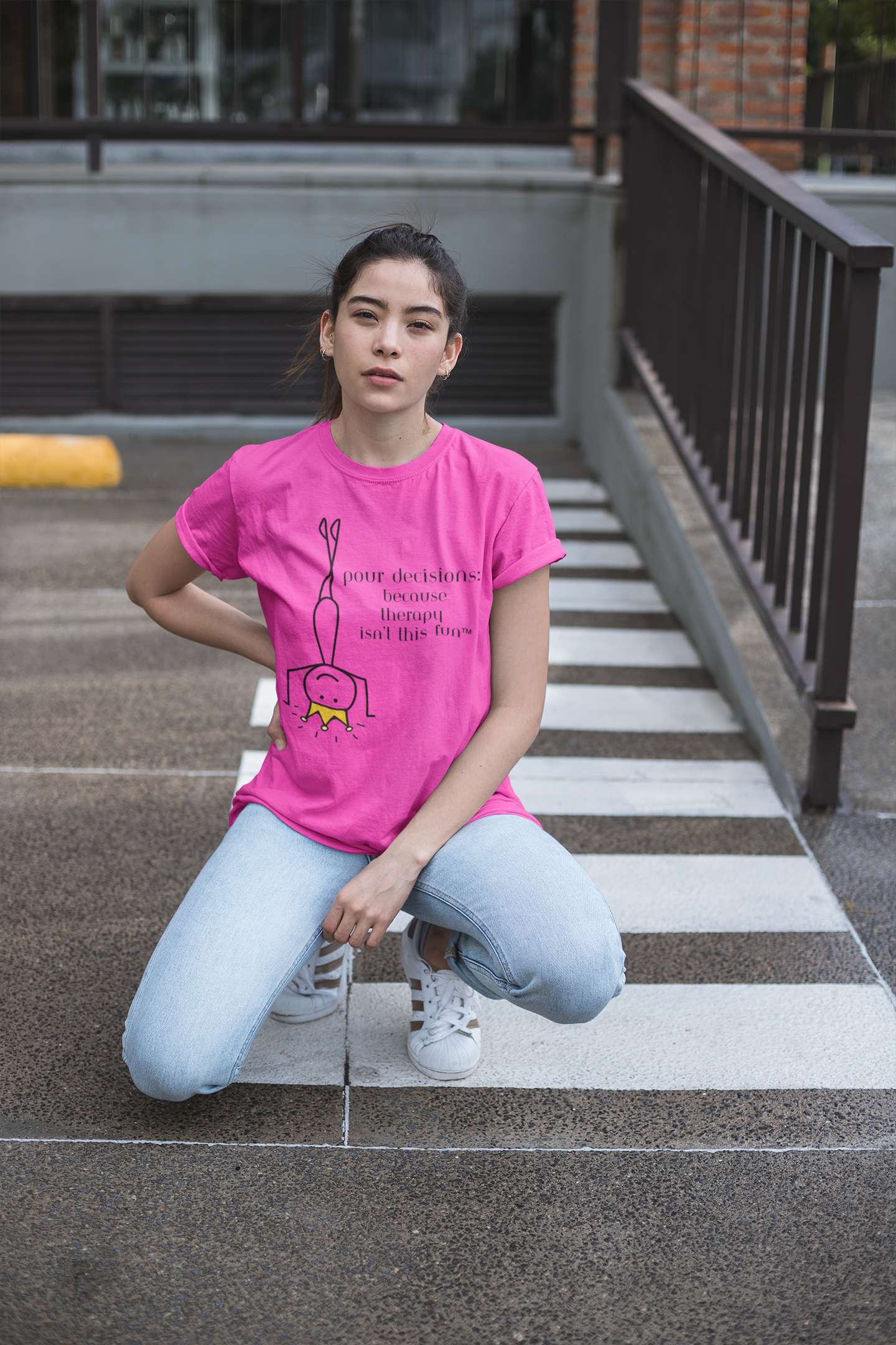 This tee is for the party queens who know that a little mischief, a lot of laughs, and a round (or three) with friends is the best therapy there is. Featuring a crowned stick figure handstand and a cheeky slogan, it’s the ultimate icebreaker for bachelorette parties, girls’ weekends, or any night you want to turn up the fun.