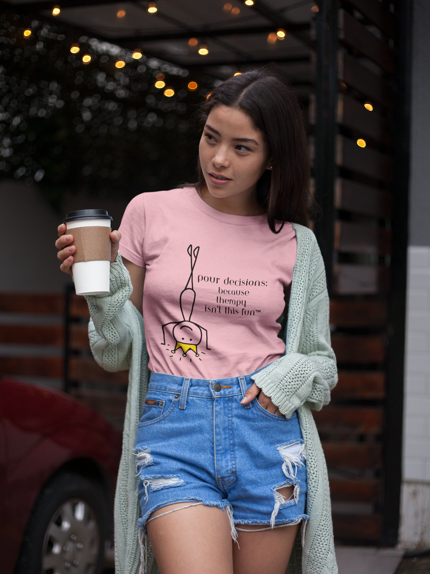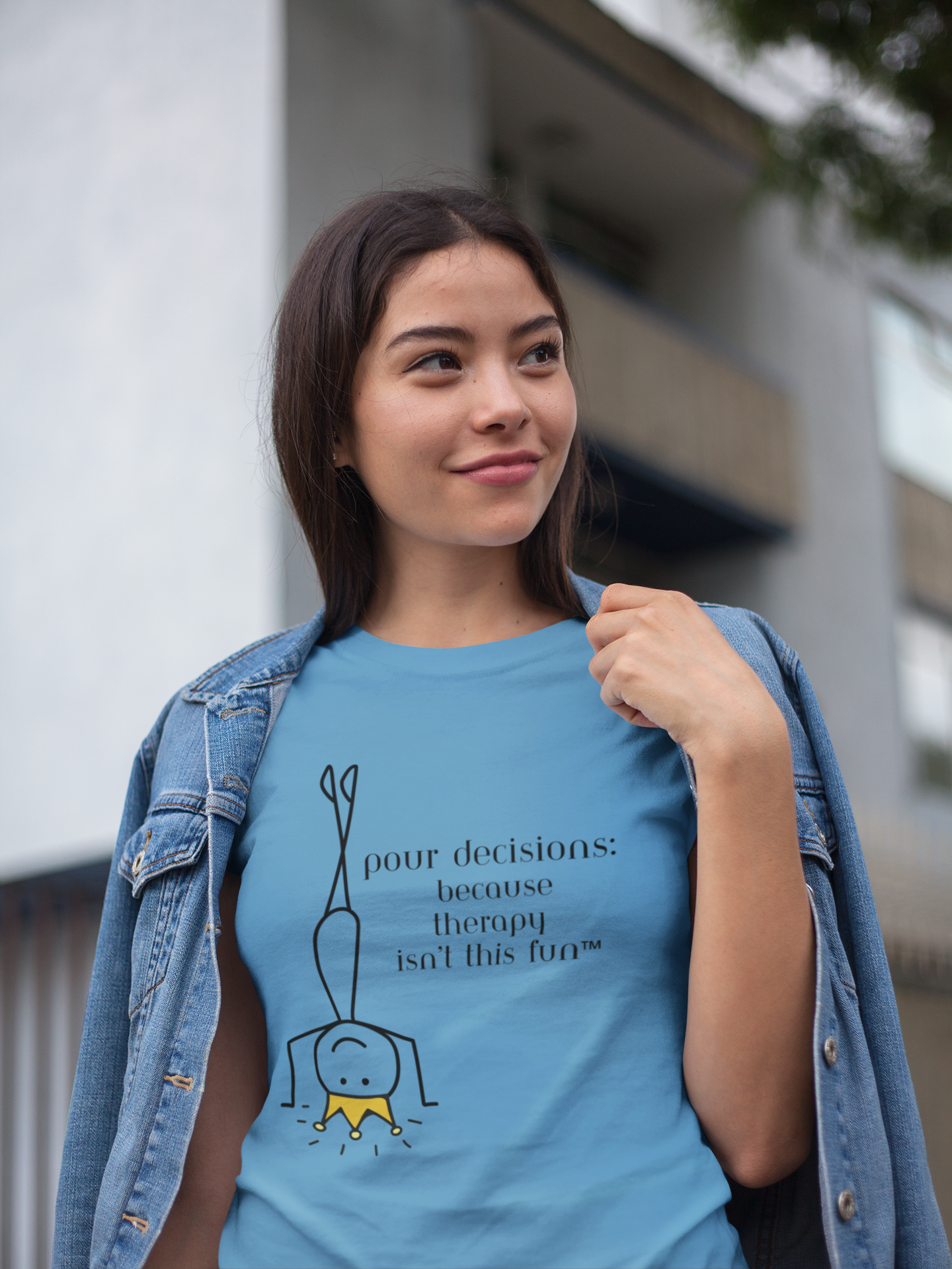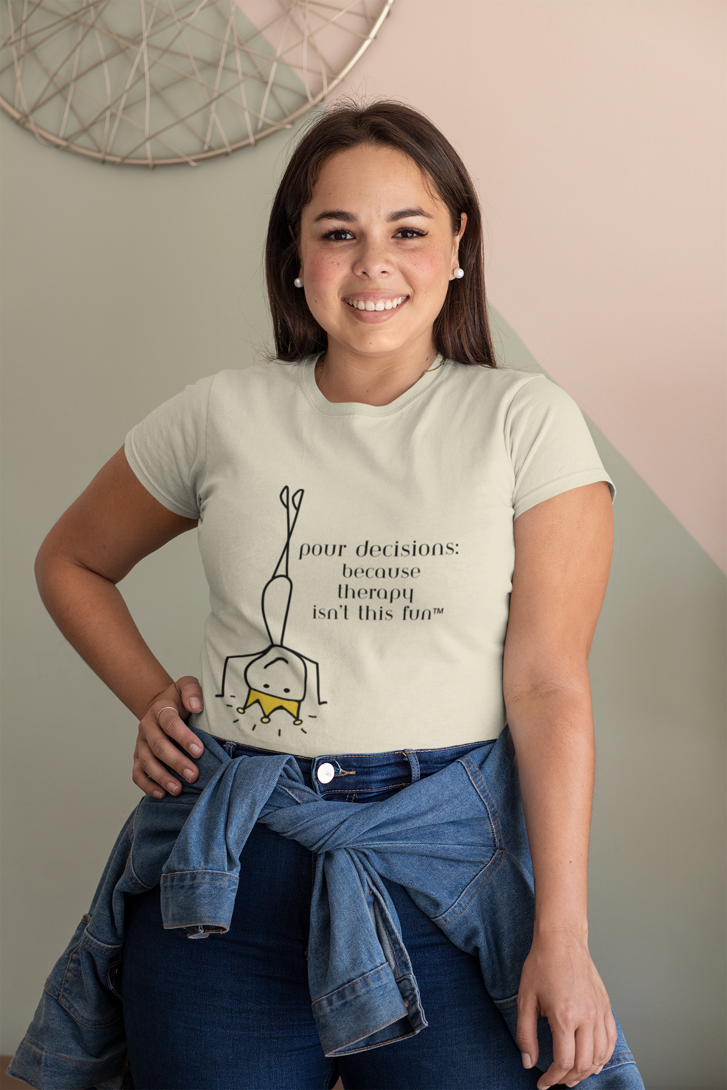 Ready to skip the couch and dive straight into the party? The “Pour Decisions: Because Therapy Isn’t This Fun™” tee comes with a Wheel of Dare QR code right on the sleeve—scan to unlock an exclusive party game and let the dares (and the laughter) begin from the very first pour!