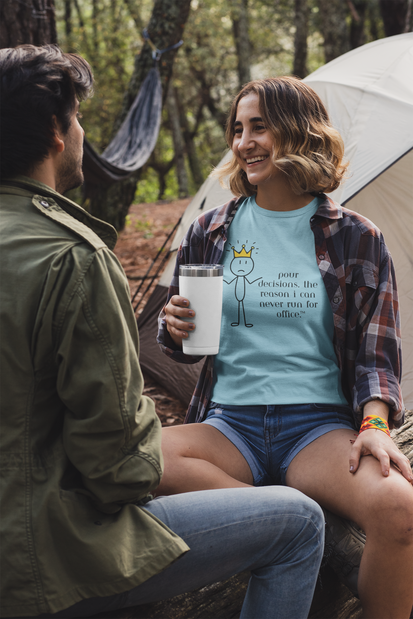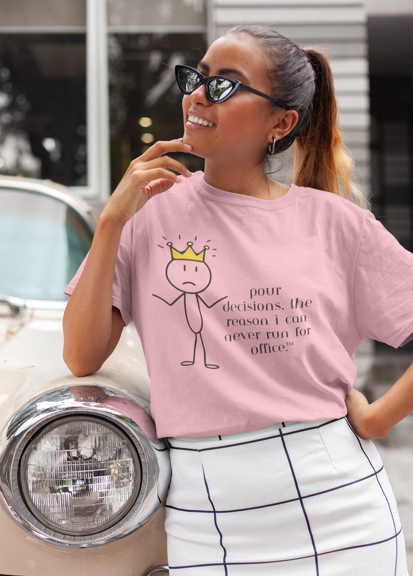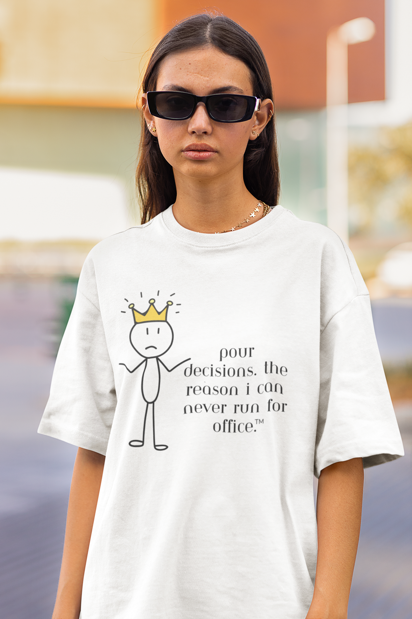 - “Pour Decisions. The Reason I Can Never Run for Office.™” crowned stick figure design: Hilarious, relatable, and totally Insta-worthy.