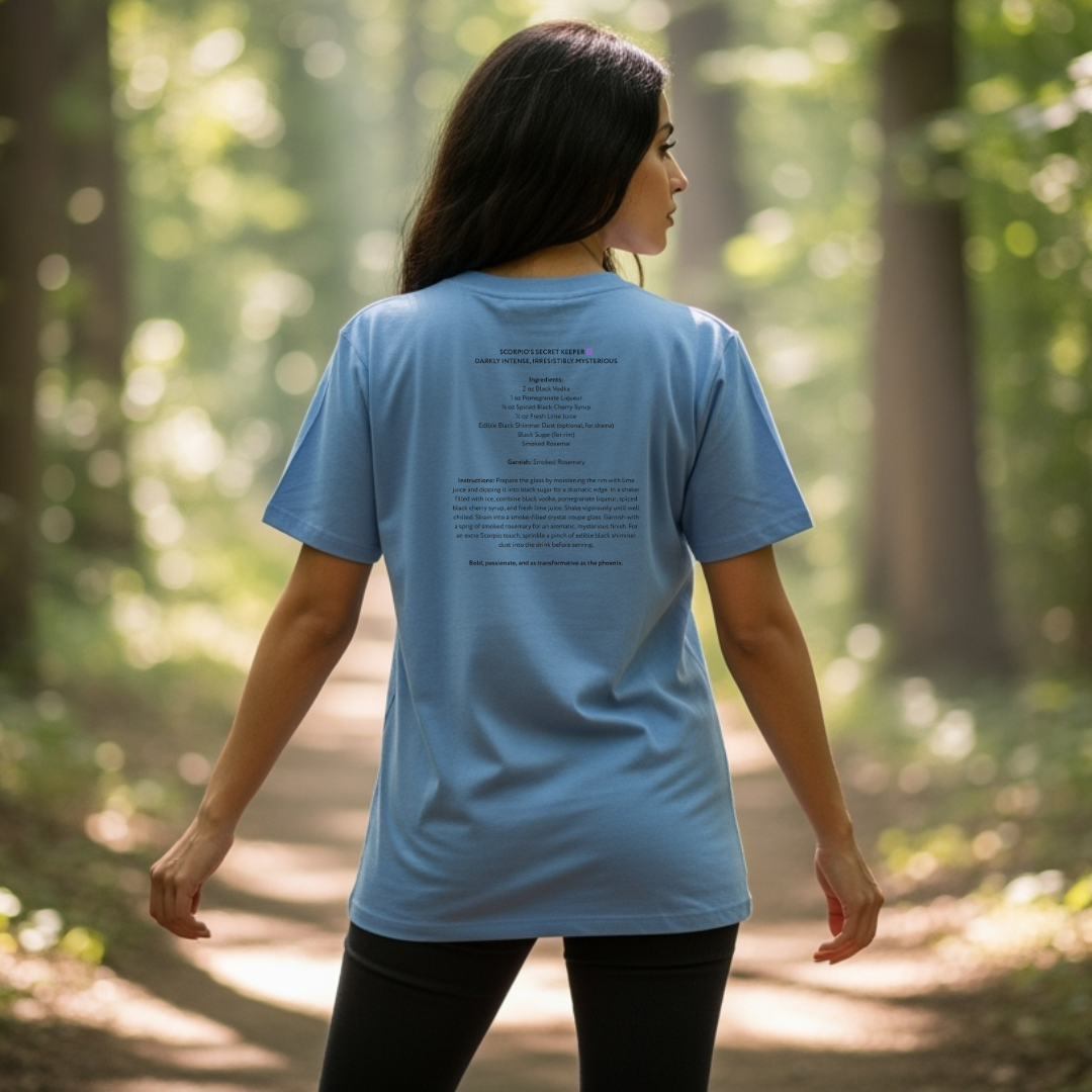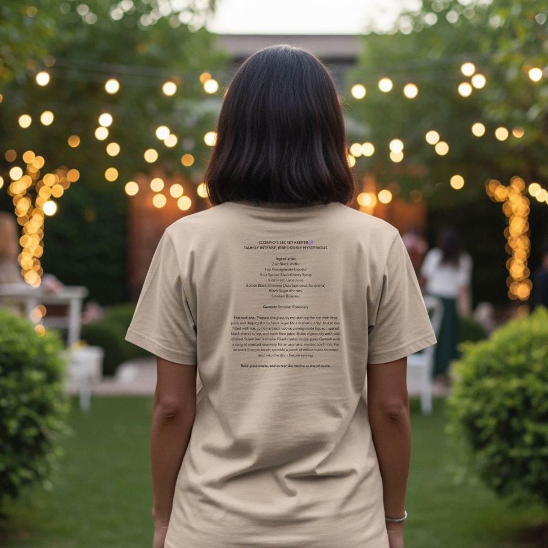 Front and center is the Scorpio’s Secret Keeper cocktail recipe, your wearable guide to a dark, intoxicating mix worthy of late nights and whispered truths. And because Scorpios thrive on intensity, every shirt comes with a dynamic Wheel of Dare QR code on the sleeve. Scan it, spin it, and unleash dares that turn any gathering into a night of mystery and thrill—whether it’s a party, birthday, or midnight adventure.