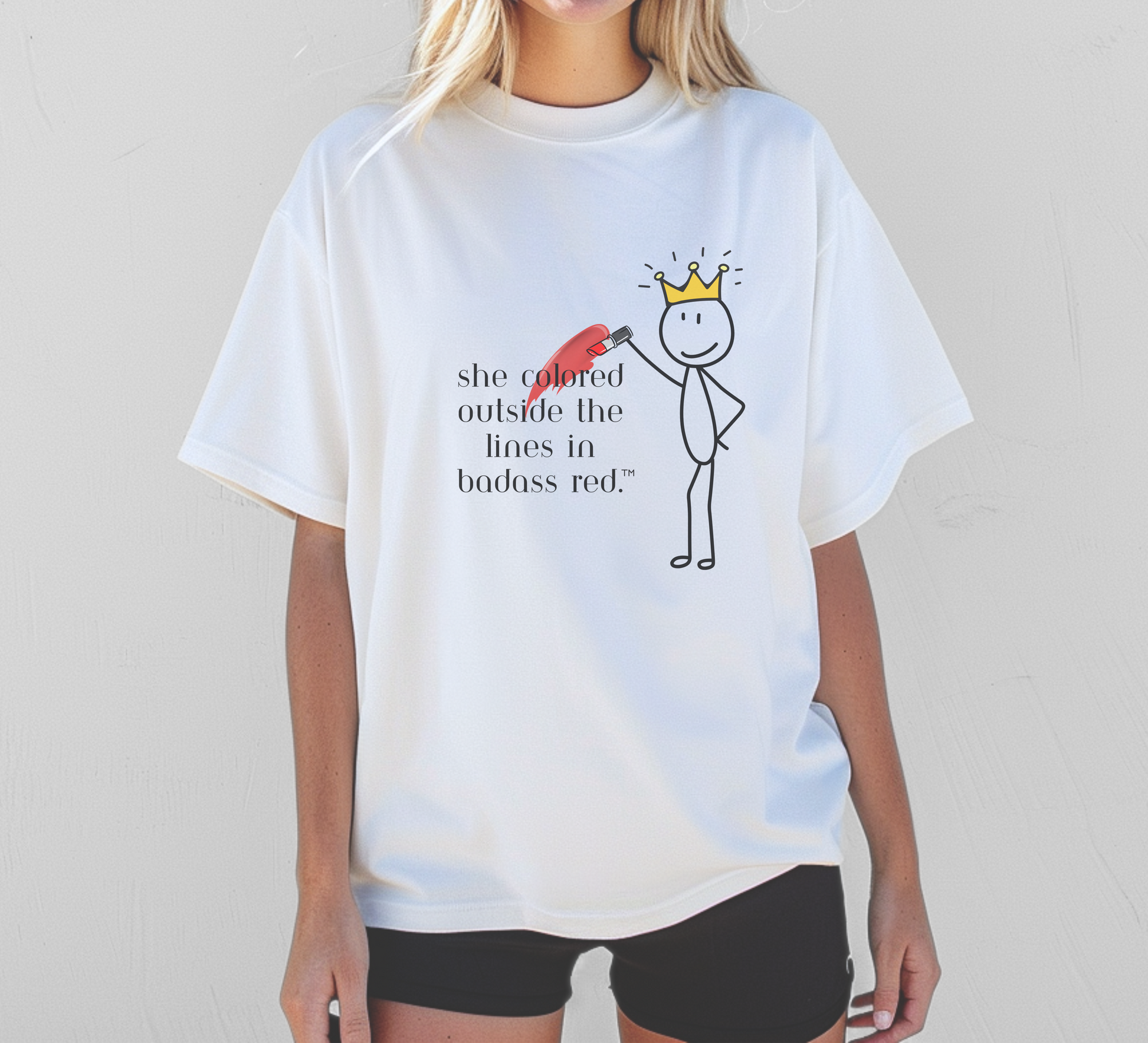 - Bold crowned stick figure & “She Colored Outside the Lines in Badass Red” design: For the queens who make their own rules.