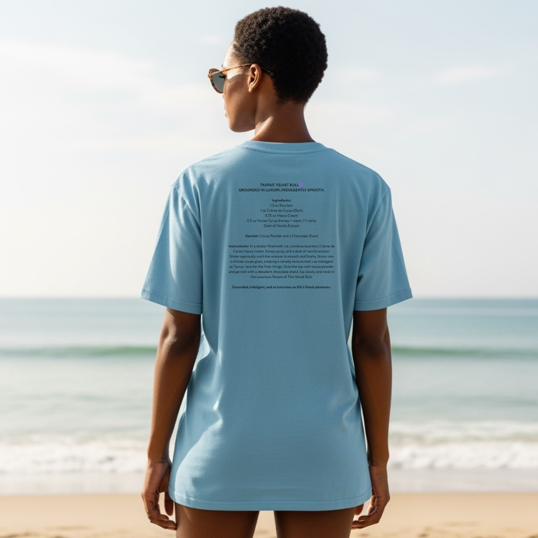 Showcasing the Taurus’ Velvet Bull cocktail recipe right on the tee, it’s your wearable mix of earthy charm and velvety flavor. And because Taurus knows that life’s pleasures are best when shared, every shirt includes a dynamic Wheel of Dare QR code on the sleeve. Scan it, spin it, and let the dares turn cozy hangs or big celebrations into unforgettable fun—whether it’s a birthday, rooftop toast, or casual night out.