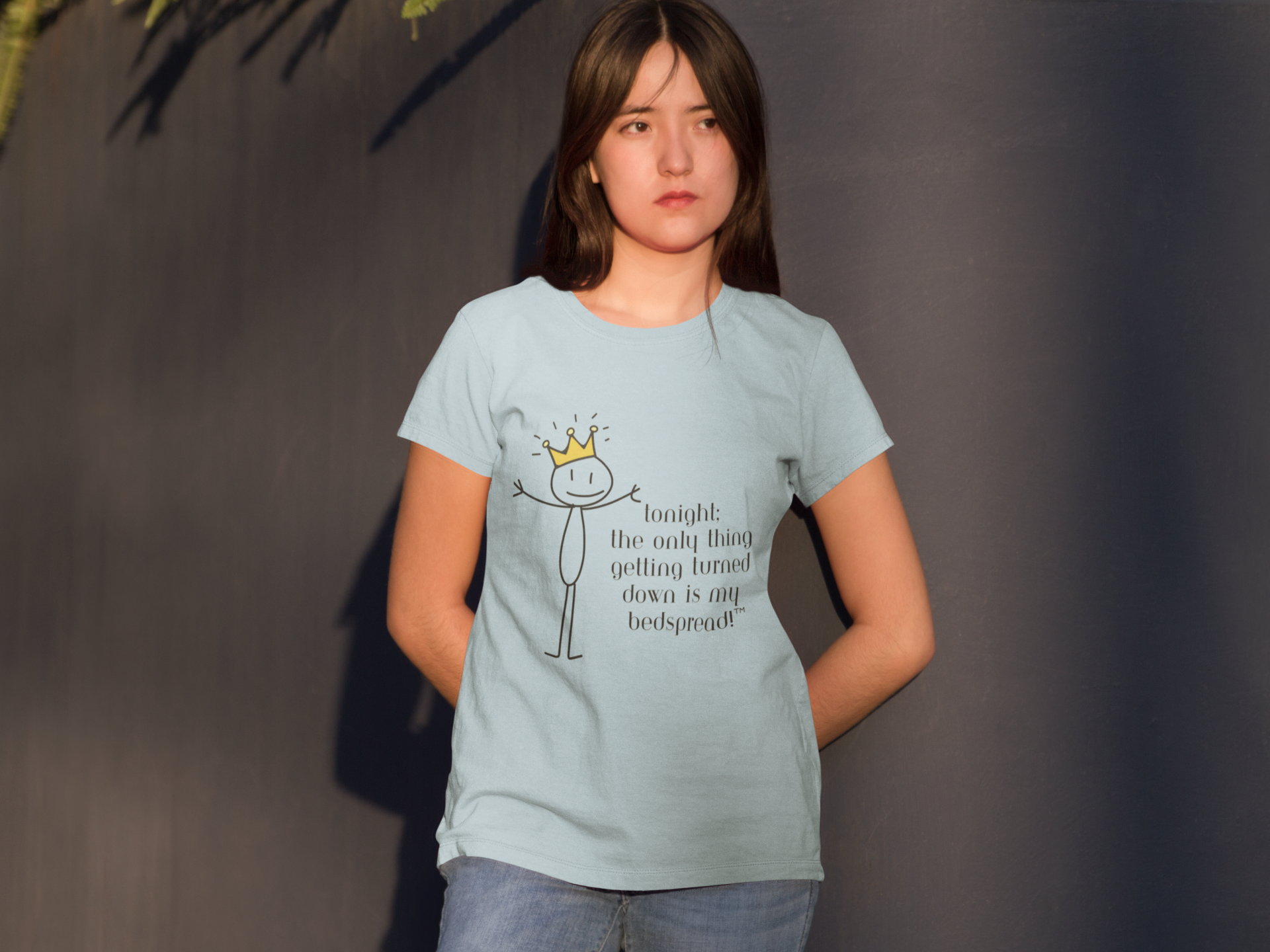 - Cheeky crowned stick figure design: “Tonight: The Only Thing Getting Turned Down Is My Bedspread!™”