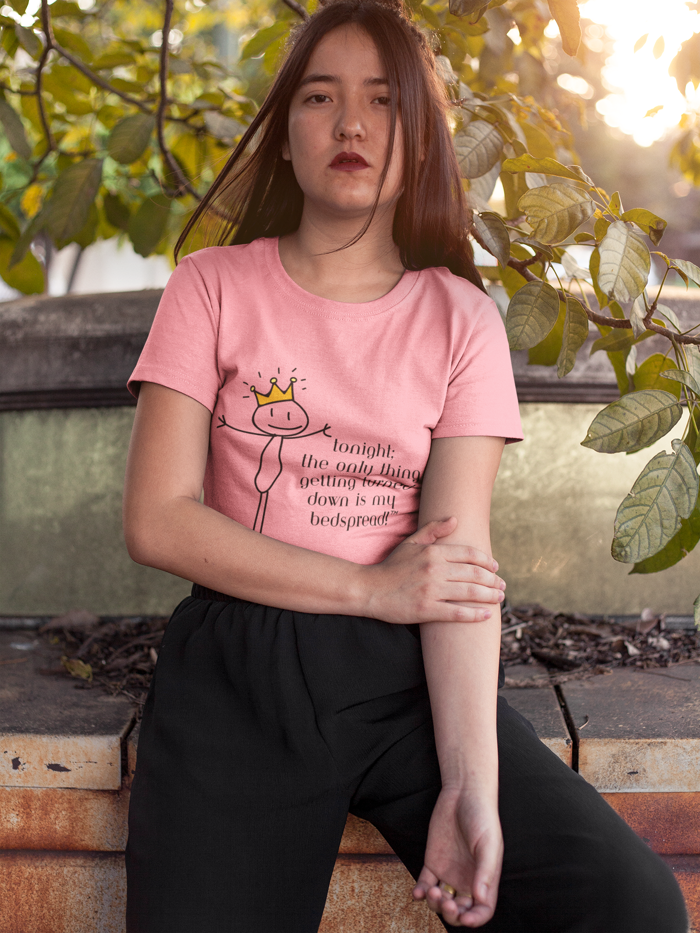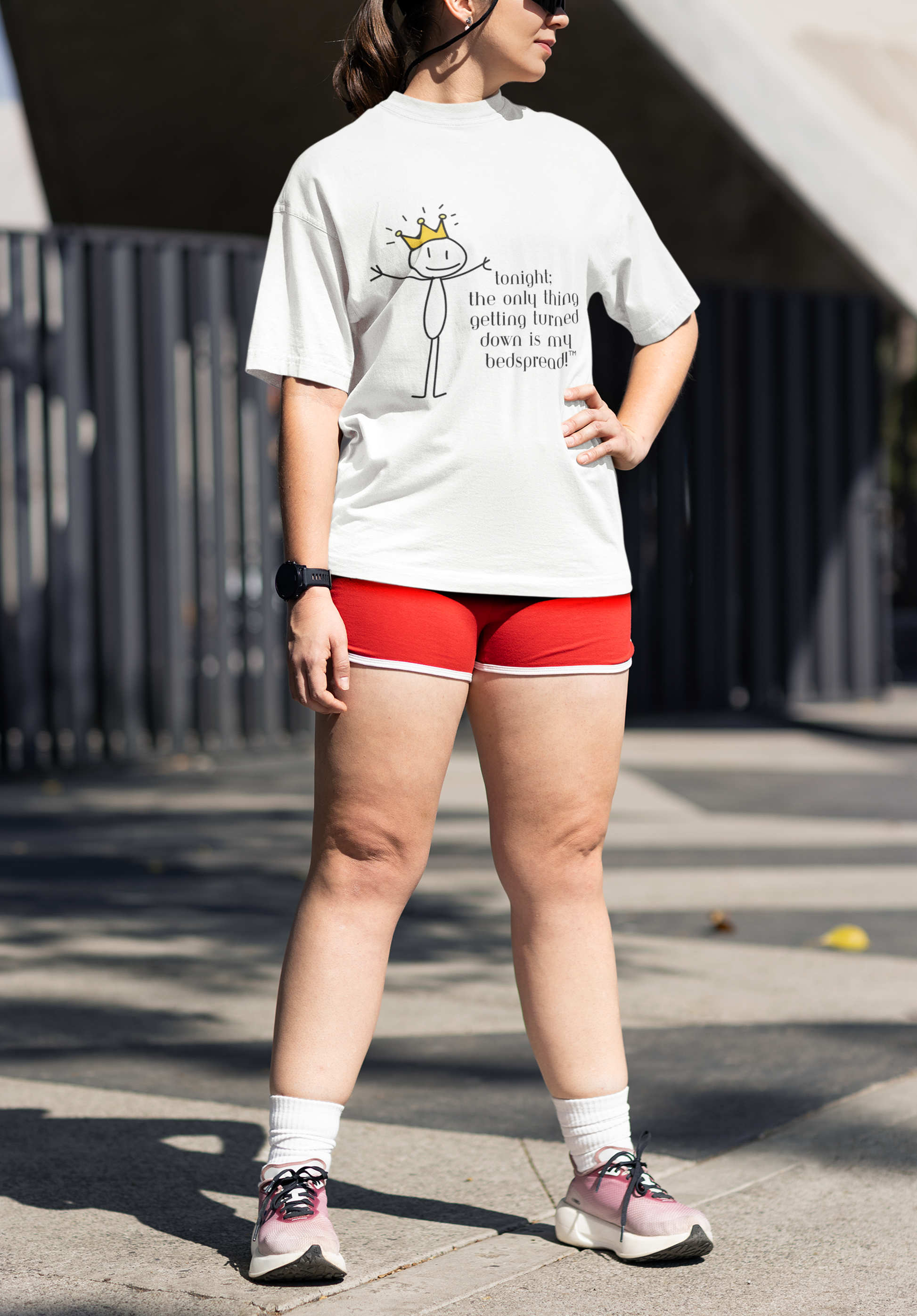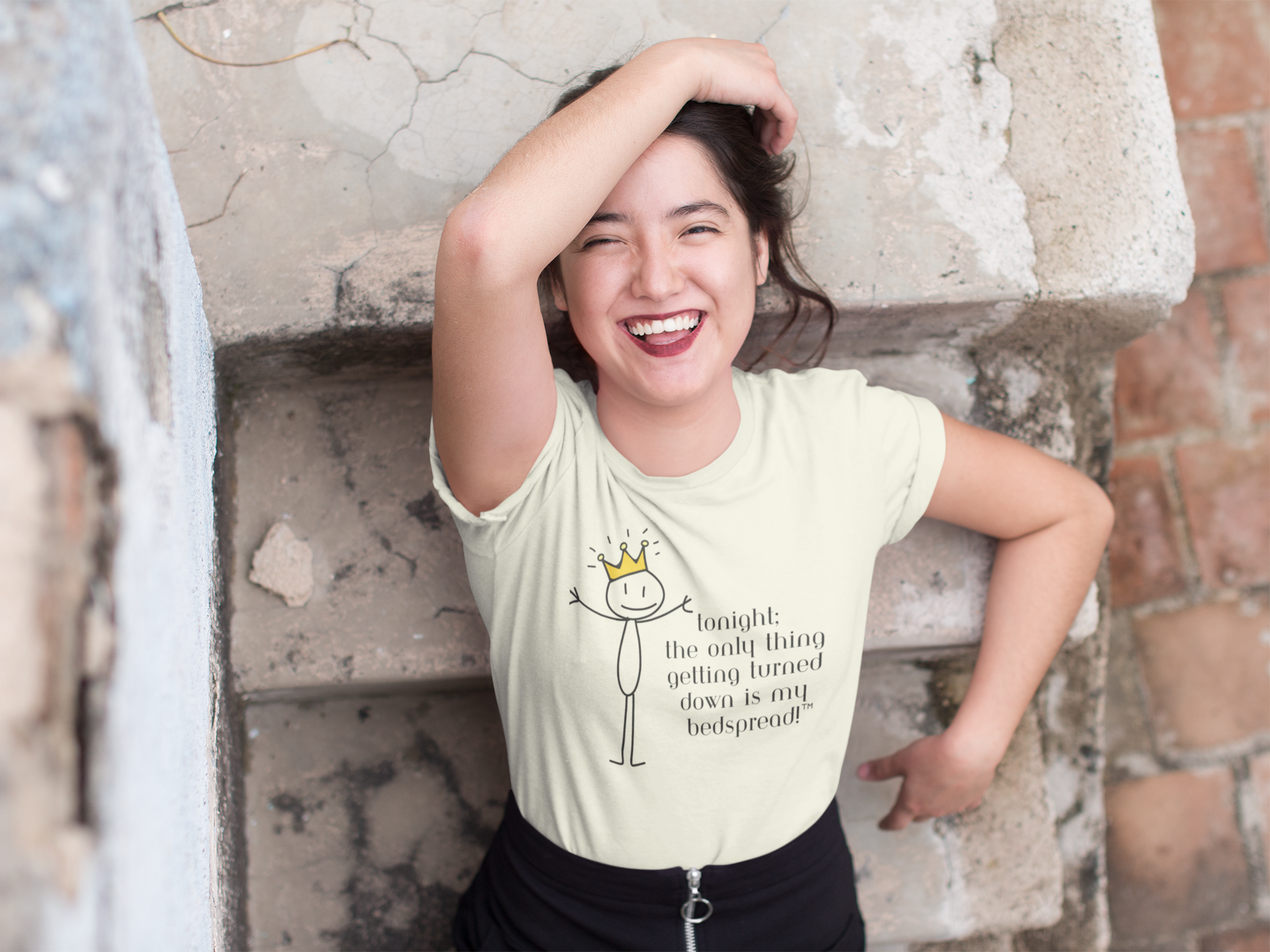 - Cheeky crowned stick figure design: “Tonight: The Only Thing Getting Turned Down Is My Bedspread!™”