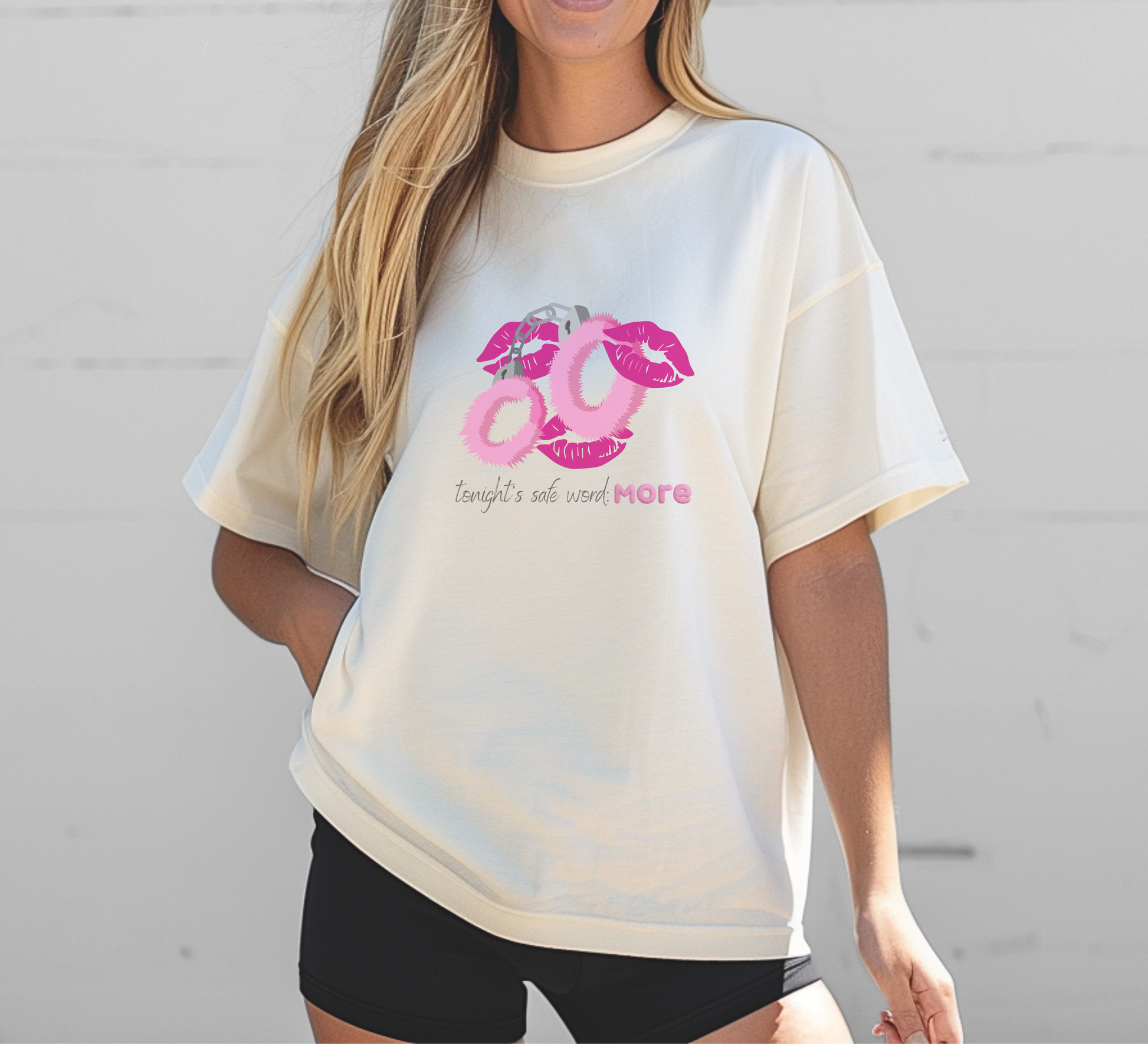 Ready to turn up the heat? This tee is for the fearless, the flirty, and the ones who know that a little mischief makes every night legendary. Featuring playful pink handcuffs, sassy lips, and the cheeky script “tonight’s safe word: More,” this shirt is your go-to for bachelorette parties, wild girls’ weekends, or any night you’re ready to break the rules and make memories.